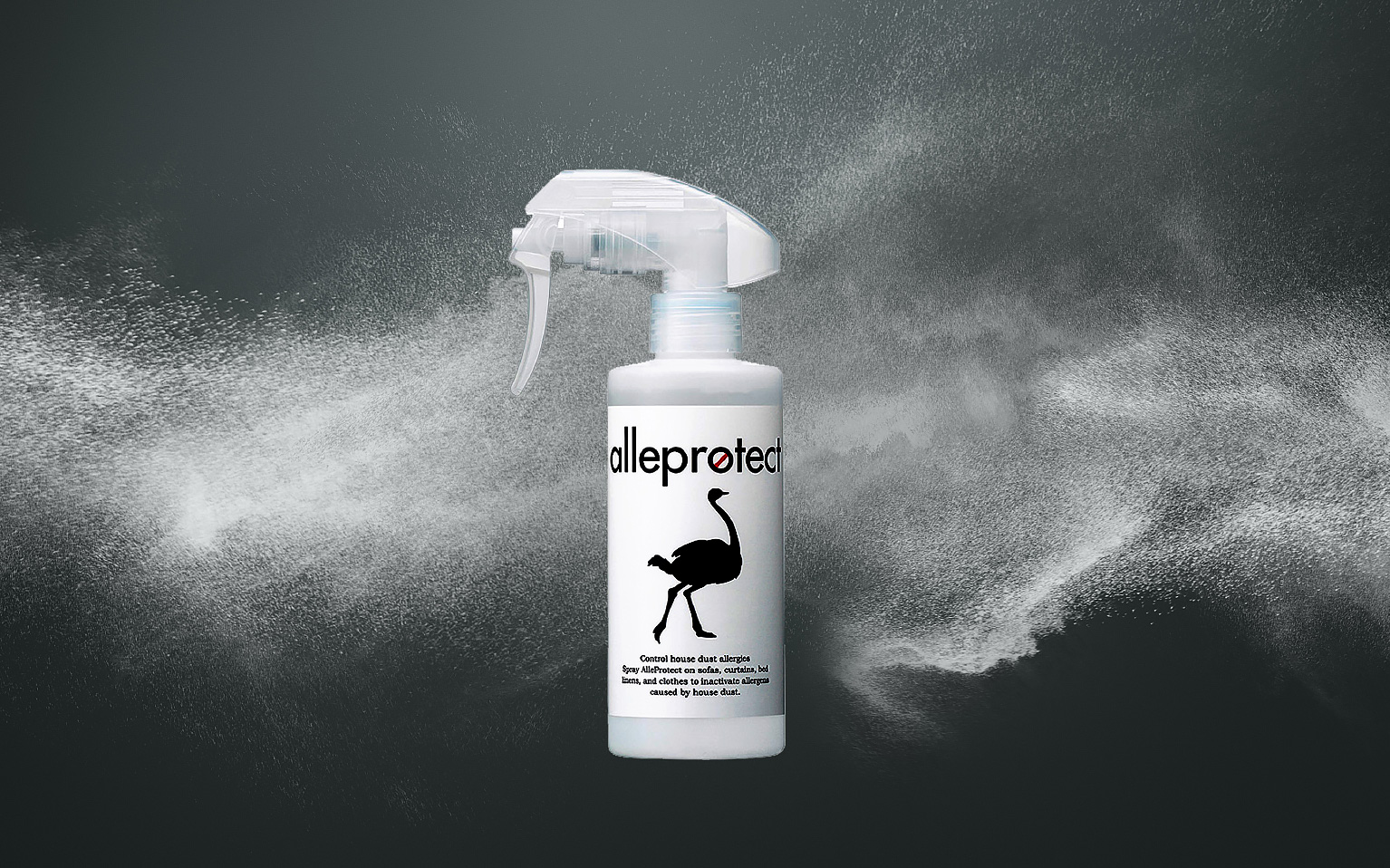 掃除などでは除去しきれず、侵入を防ぐことも困難なハウスダスト。 ハウスダストの発生を抑えるのではなく、アレルギーの一因となる「ダニのフンや死がい」に吸着し無害化する抗体原料を配合したのが「alleprotect」です。 空気中に舞ったハウスダストも、天日干しでは除去しきれなかったハウスダストにも、抗体原料「ダチョウ抗体成分」が吸着してその働きを抑えて無害化します。